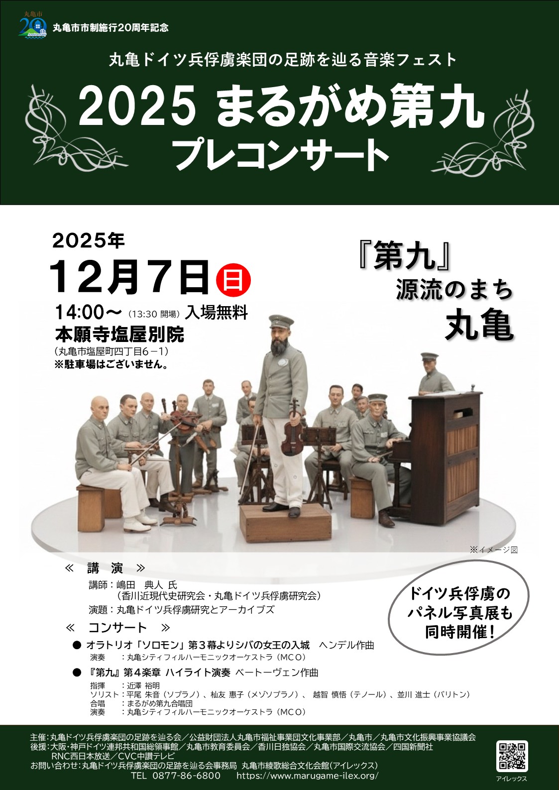 「第九」(ベートーヴェン作曲交響曲第9番ニ短調作品125「合唱付」)は、1918年に徳島県鳴門市にあった板東俘虜収容所で、ドイツ兵俘虜が全曲演奏を行ったのが日本における初演とされています。その演奏を行ったドイツ兵の一部は、それ以前に、丸亀市塩屋町の本願寺塩屋別院に収容され、楽団を結成して演奏活動を行っていたことから「第九」と丸亀市には深い関わりがあります。